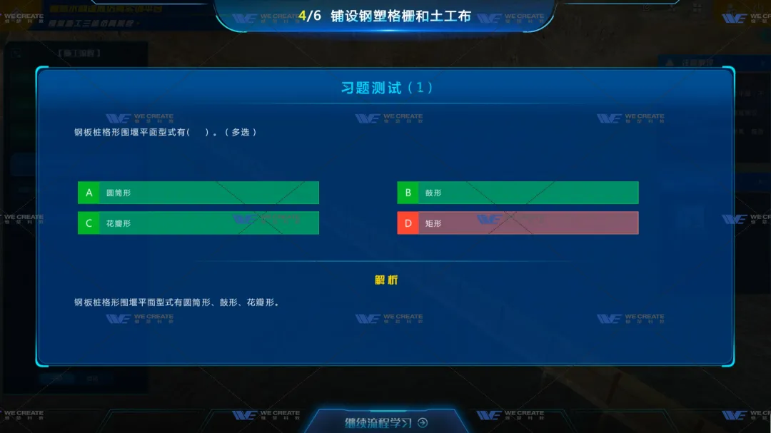 在每个施工步骤中,用户需根据工程需求选择适配的施工机械,系统随即生成对应工况下的施工工艺全流程动画演示,并辅以施工标准、注意事项等文字资料,帮助用户全面了解施工环节的操作流程和技术要点;同时,系统支持用户对单个或多个施工步骤进行反复学习,确保用户能够能够针对薄弱环节进行专项强化训练。