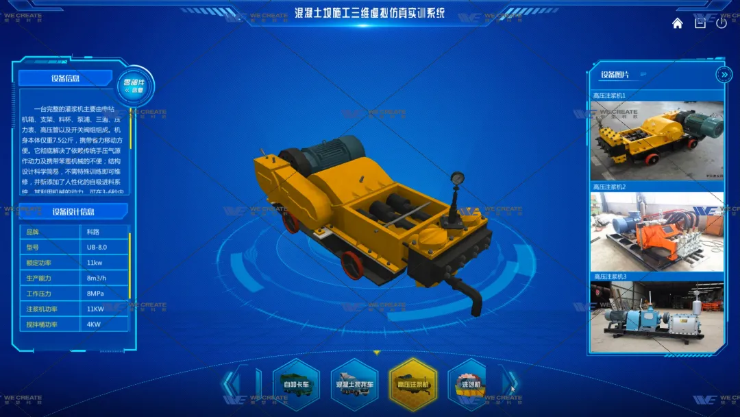 系统依托先进的三维可视化技术,对水利工程主体结构(如重力坝、隧洞等)、周边环境及施工设备进行高精度建模,以立体动态的形式还原工程建设全貌。同时,整合设备资料,包括基本资料简介、参数信息、实际图片等多媒体素材,构建全面的设备知识体系,以强化用户对设备操作和应用的理解。