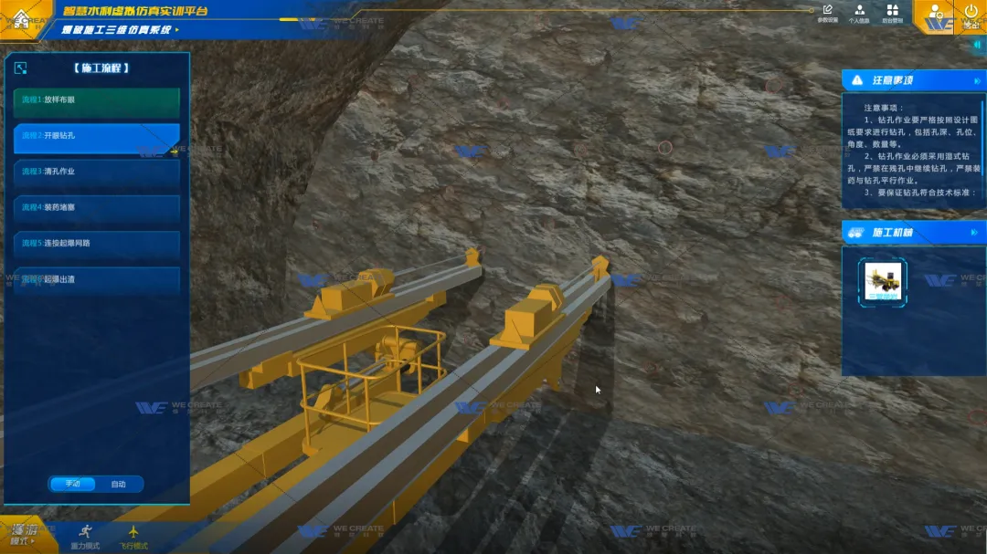 在传统水利工程教学体系中,工程施工环节的教学始终面临双重困境:一方面,二维图纸与文字教材难以完整呈现复杂施工场景的空间关系与动态流程;另一方面,学生因缺乏真实工程环境的沉浸式体验,对施工工艺、机械操作等知识的理解长期停留在理论层面,导致理论与实践严重脱节。本系列产品聚焦于施工工艺、流程及方案,通过仿真模拟技术再现工程施工的全过程,并结合理论知识与实际生产经验,开发了水利工程施工三维实训系统。系统集施工注意事项学习、施工机械选择、工艺动画演示、工艺考核等功能于一体,构建综合性的施工实训平台,以辅助学生深入理解并掌握水利工程施工的关键技术和流程。