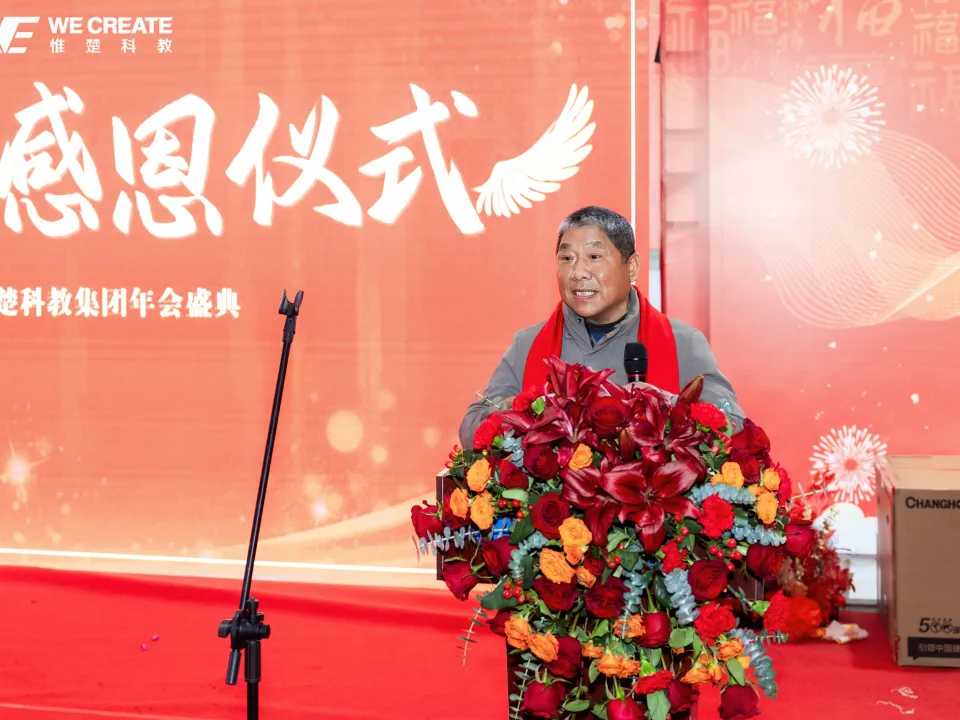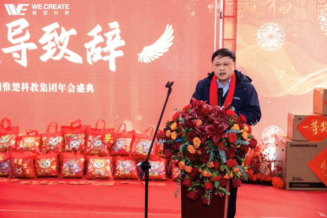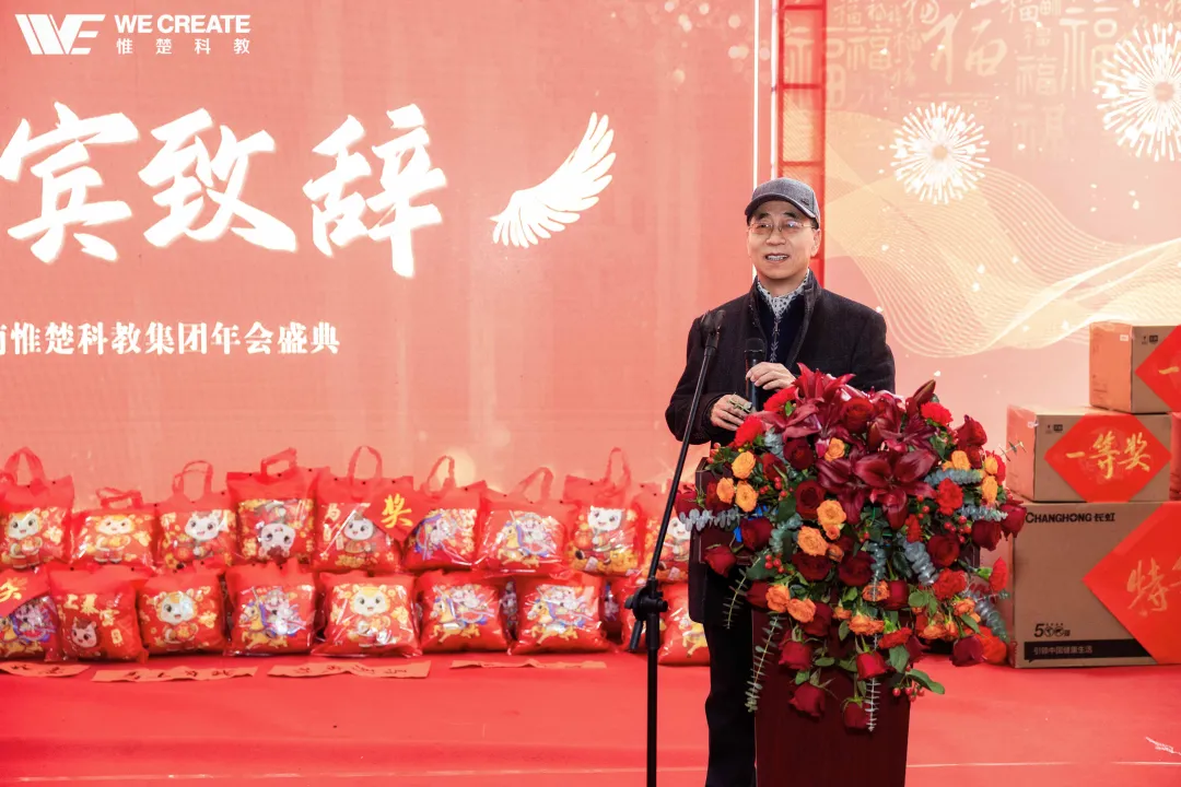 年会在浏阳分公司总经理、公司创始人吴恒先生的开幕致辞中拉开帷幕。他首先向全体在场员工、家属、专家及合作伙伴致以诚挚的新春问候,并系统回顾了公司在过去一年中,在实训设备研发、智慧教育项目推进及世界技能大赛参与等方面取得的突破与成绩。