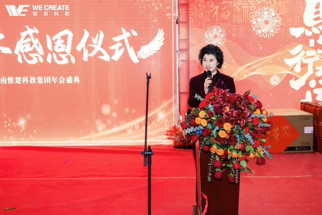 团聚之际,惟楚股份总经理刘良启女士登台讲话,以感恩为核心,向全体员工、退休前辈、员工家属及行业专家致以诚挚感谢。 她结合2025年公司发展实践,肯定各部门协作成效、梳理不足并明确改进方向,紧扣年会主题激励全体惟楚人以骏马之姿坚守匠心、协同创新,强调公司将坚守“以人为本”,完善成长与关怀机制,与大家同心共赴新未来,发言赢得全场掌声。